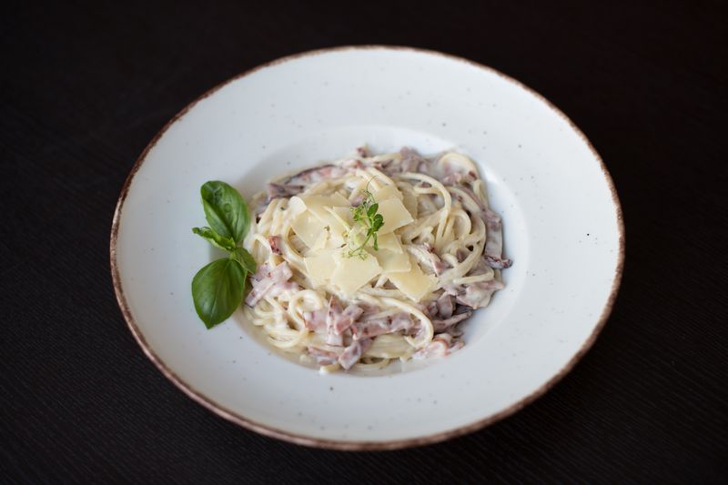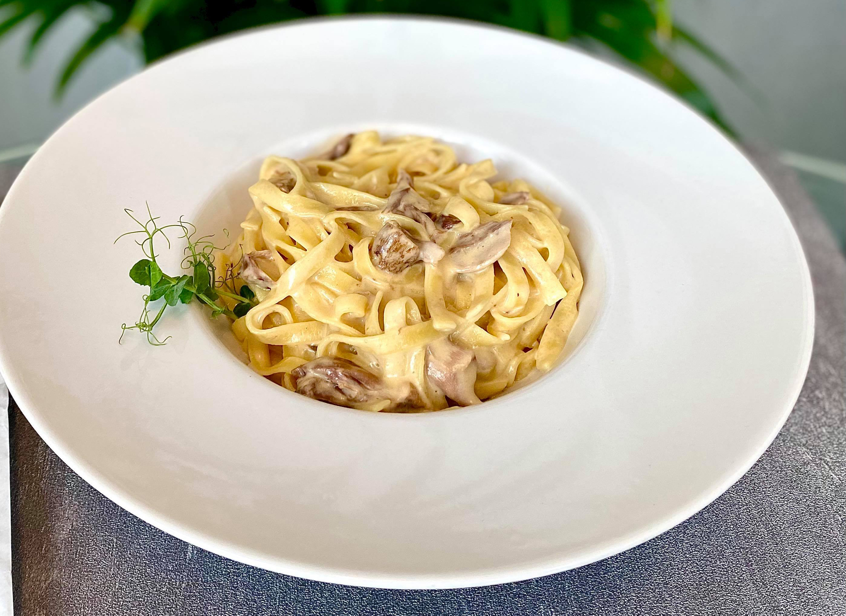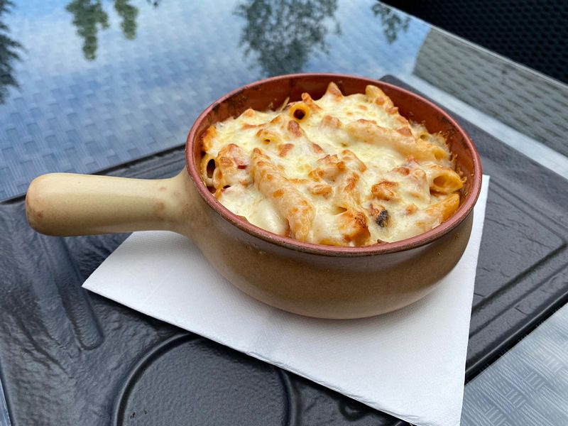 penne, ulei, ciuperci , piept pui, bacon, usturoi, sos de rosii, smantana lichida, oregano, mozzarella