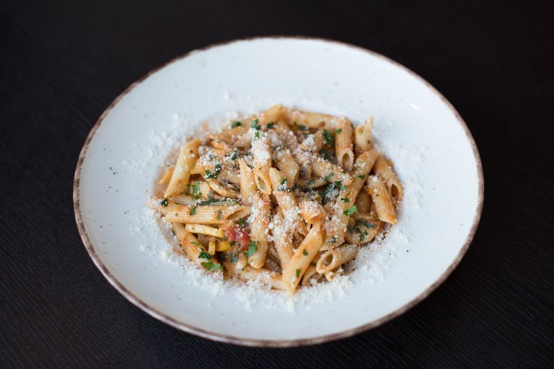 penne, sos rosii, dovlecel, ardei galben , ciuperci , usturoi , parmezan