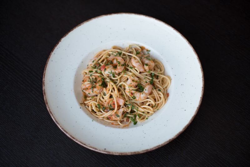 spaghete, creveti, sos rosu , patrunjel, peperoncini, pasta usturoi