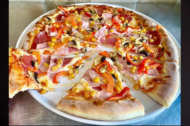 sos de rosii, mozzarela, ciuperci, sunca, salam, masline negre feliat