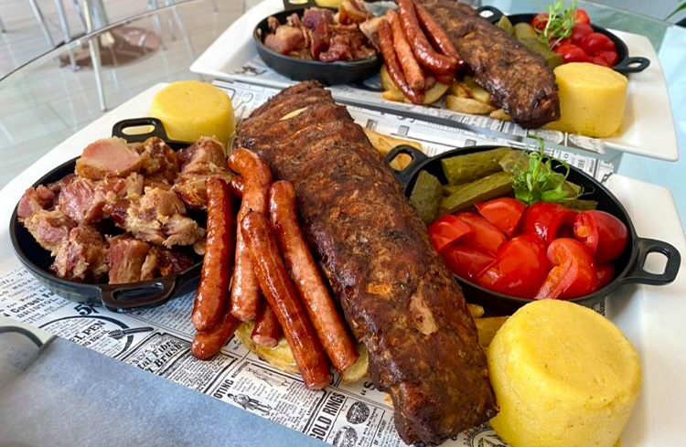 Platoul gurmanzilor pentru 2 persoane: carne la garnita, coaste la gratar, carnati cabanos, mamaliguta coapta, mujdei, muraturi asortate