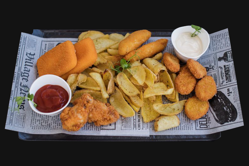 Platou cald pentru 2 persoane : aripioare crocante, gujon de pui, cascaval pane, nuggets de pui, cartofi dippers, sos de maioneza, sos ketchup