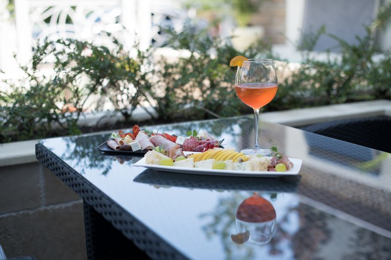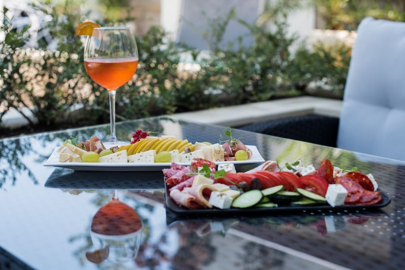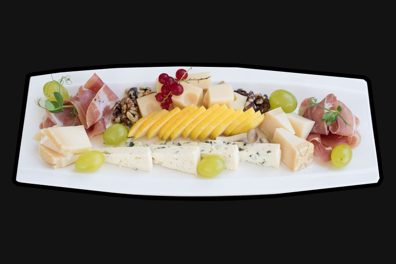 Platou italian: prosciutto crudo, gorgonzola, ementailer, parmezan, struguri, mere, nuci