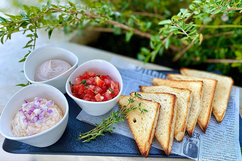 Omletă, salată asortată, măsline, cârnăciori, bacon, ciuperci umplute, pâinea casei